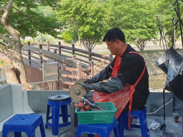 ㈜가람테크는 지난 5월 27일 김천시 부항면 월곡리를 방문해 부엌칼을 갈아주는 재능기부 봉사를 진행했다.