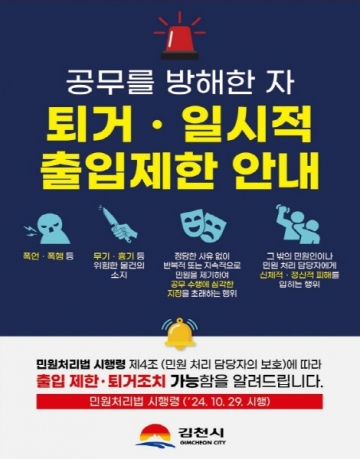 김천시가 공무수행을 방해하는 악성 민원인에 대한 출입제한 및 퇴거조치를 본격 시행하는 등 민원 환경 개선에 나섰다.